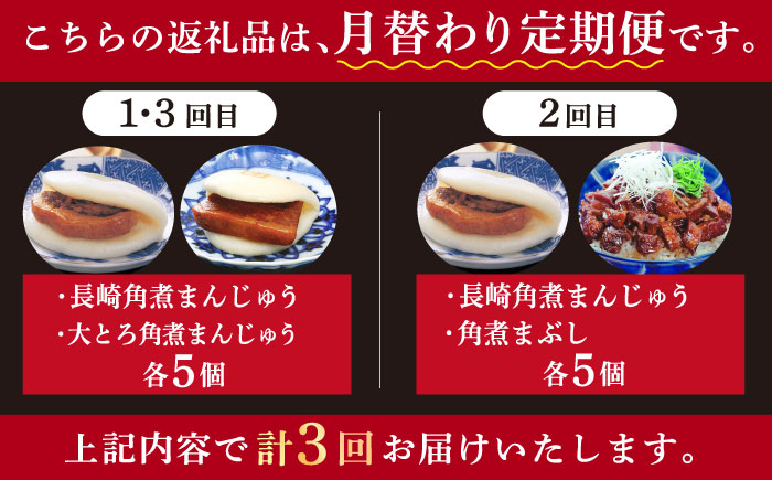 - 【3回定期便】<月替り!> 長崎角煮まんじゅう+大とろ角煮まんじゅう(各5個)・長崎角煮まんじゅう+角煮まぶし(各5個)角煮 ≪小値賀町≫ 【岩崎本舗】 [DBG071]