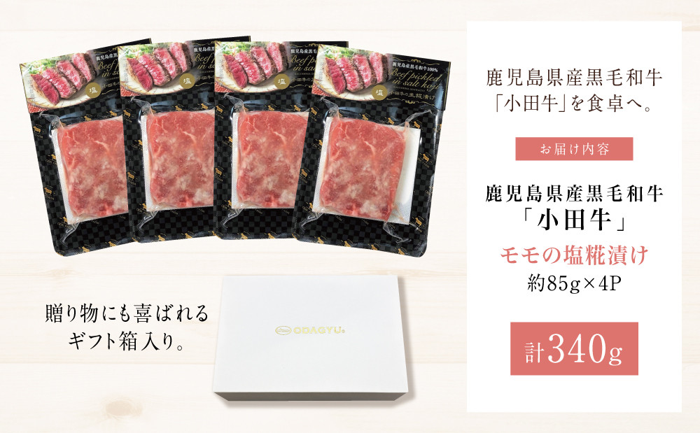 - 【プレミアムブランド】鹿児島県産黒毛和牛「小田牛」 モモステーキの塩糀漬け 約85g×4P 計340g 国産 牛肉 加工品 冷凍 黒毛和牛 モモ 漬けダレ肉 こうじ 塩麹 生麹 焼肉 バーベキュー BBQ 小田畜産 プレゼント ギフト 贈り物 贈答 冷凍 南さつま市