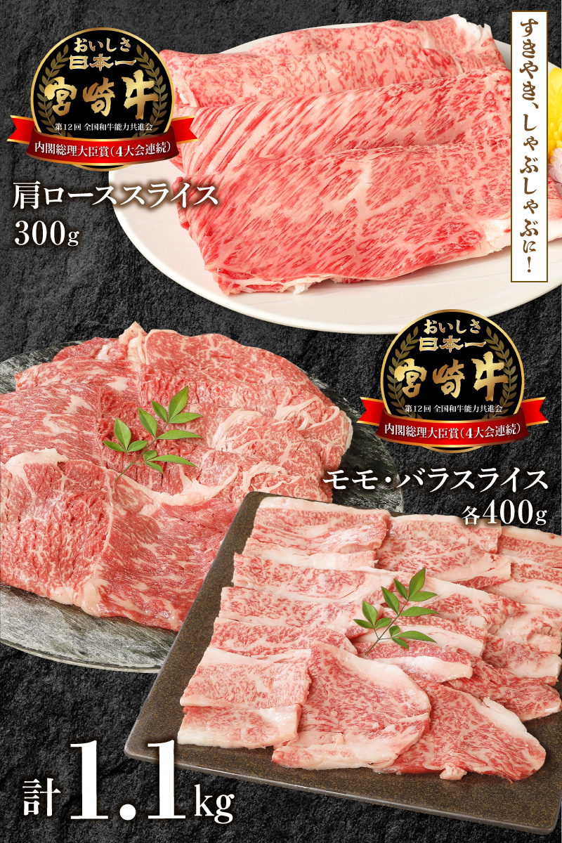 宮崎牛肩ローススライス300g モモスライス400g バラスライス400g 計1.1kg N0147-YC235