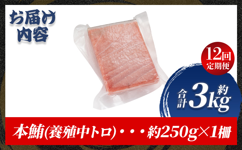 - 中トロ 定期便 12回 約250g 1冊 養殖 本マグロ 合計3kg - 鮪 まぐろ 中とろ 寿司 刺身 さしみ 海鮮丼 漬け丼 カルパッチョ おつまみ 新鮮 海産物 魚介 海の幸 オオジ 高知県 香南市 Woo-0030