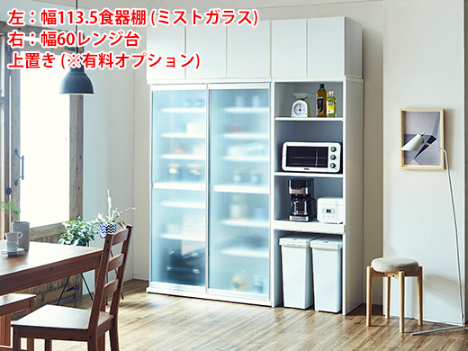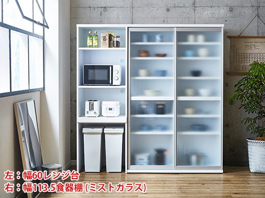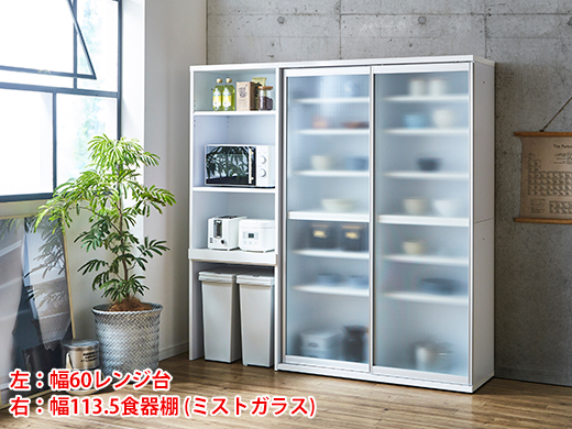 - 【開梱設置】引き戸 食器棚 ダイニングボード ポエム 幅113.5 (ミスト・クリア・スモークガラス)ホワイト キッチン収納 家具