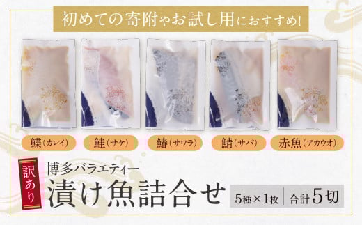 W61-76 訳あり 博多バラエティー漬け魚詰合せ 5切 魚 海鮮 魚介 銀鰈 ぎんだら 鮭 さけ 鰆 さわら 鯖 さば 赤魚 あかうお 詰め合わせセット ギフト 贈答 おかず おつまみ 漬け づけ