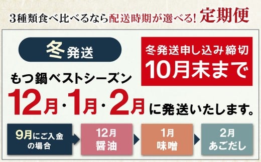 W61-85 【定期便】 博多若杉 牛もつ鍋4~5人前(年3回・毎月1種)★冬発送 福岡 福智町 福智 もつ鍋 もつ 牛もつ モツ 鍋 冬 本場 国産牛 モツ鍋 もつ もつ鍋 牛肉 肉 小分け 冷凍 ホルモン セット 博多 若杉 博多若杉 牛もつ ぷりぷり おいしい 醤油味 醤油 しょうゆ こってり味噌 みそ 定期便