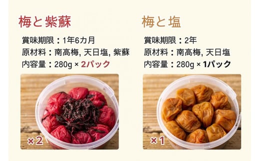 - 【無添加梅干し】塩と紫蘇だけで漬けた梅干し2パック、塩だけで漬けた梅干し1パック / 南高梅 umehkr009
