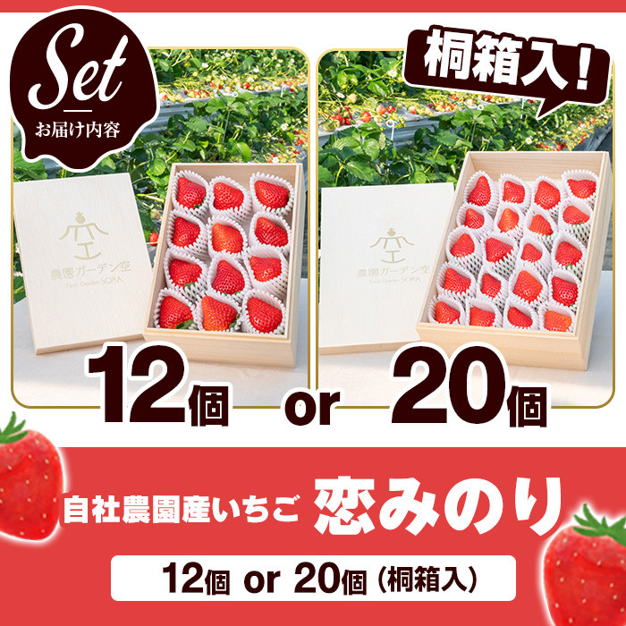 <先行予約受付中!2026年1月以降順次発送予定><内容量が選べる!>桐箱入!自社農園産いちご 恋みのり(計12~20個) 鹿児島 阿久根 自社農園 果物 フルーツ イチゴ いちご 苺 恋みのり 贈答用 ギフト 桐箱 デザート 期間限定【農園ガーデン空】