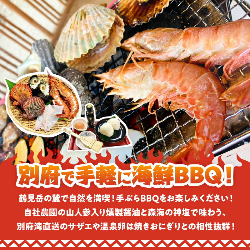 - 【ふるさと納税】海鮮 バーベキュー 体験 チケット 1名分 手ぶら BBQ 遠赤外線効果 炭火 天然食材 サザエ ヒオウギ貝 イカ エビ おにぎり 地獄蒸し たまご 炭 燻製醤油 森海の神塩 海の幸 大分県 別府市 送料無料