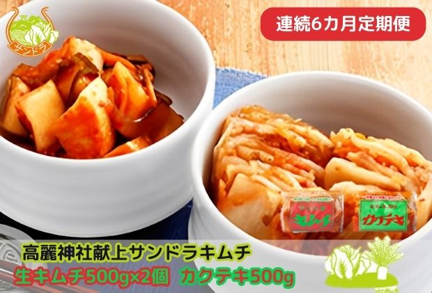 - 【ふるさと納税】定期便 6か月 冷蔵便 キムチ 500g×2 カクテキ 500g×1 セット 塩分控えめ 減塩 高麗神社献上 サンドラ 国産 白菜 漬物 乳酸菌 おかず ご飯のお供 おつまみ 発酵食品 大根 GABA 便利 アレンジ 送料無料