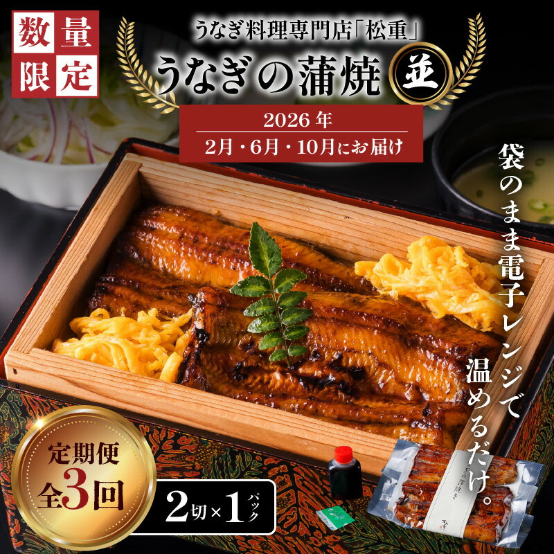 - 【ふるさと納税】 全3回 定期便 うなぎ料理 専門店 松重 まつじゅう 【 並 】 うなぎ 蒲焼 2切(1尾)× 1パック 【2・6・10月お届け】 鰻 ウナギ うな重 うな丼 ひつまぶし たれ 土用 丑の日 数量 期間 限定 鹿児島 おすすめ ランキング プレゼント ギフト