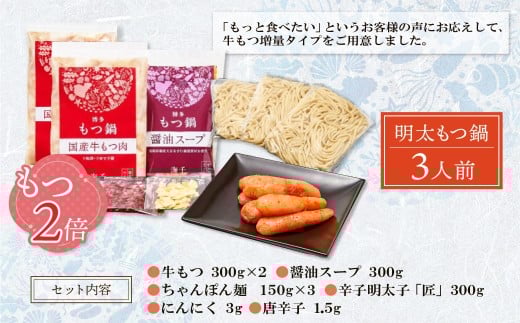W71-04 【牛もつ2倍】博多明太もつ鍋(醤油味)3人前 もつ鍋 ホルモン 肉 鍋 福岡 博多 もつ 明太子 ギフト グルメ おすすめ 鍋 冬 増量 もつ2倍 冷凍