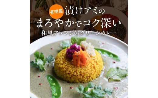 - 魚介のグリチリカレー_有明名産 漬けあみ グリーンカレー 180g × 5パック 和製 コク深い 鼻から抜ける爽やかな辛さ カレー カレーライス 時短 レトルト 食品 加工品 肉加工品 惣菜 福岡県 久留米市 お取り寄せ お取り寄せグルメ 送料無料_Ca024