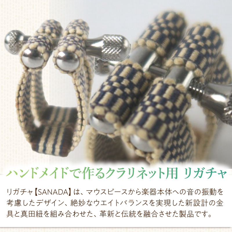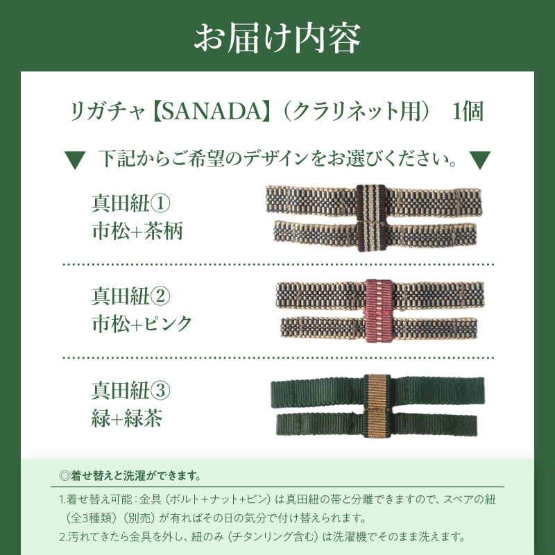 リガチャ【SANADA】 クラリネット用 [195S13] リガチャ SANADA 選べる デザイン 市松 茶 ピンク 緑 緑茶 マウスピース チタンリング クラリネット 音質向上 音質改善 耐久性 着せ替え可能 洗濯可能 洗える 紐 ボルトナット 楽器アクセサリー 楽器パーツ 愛知県 小牧市 送料無料