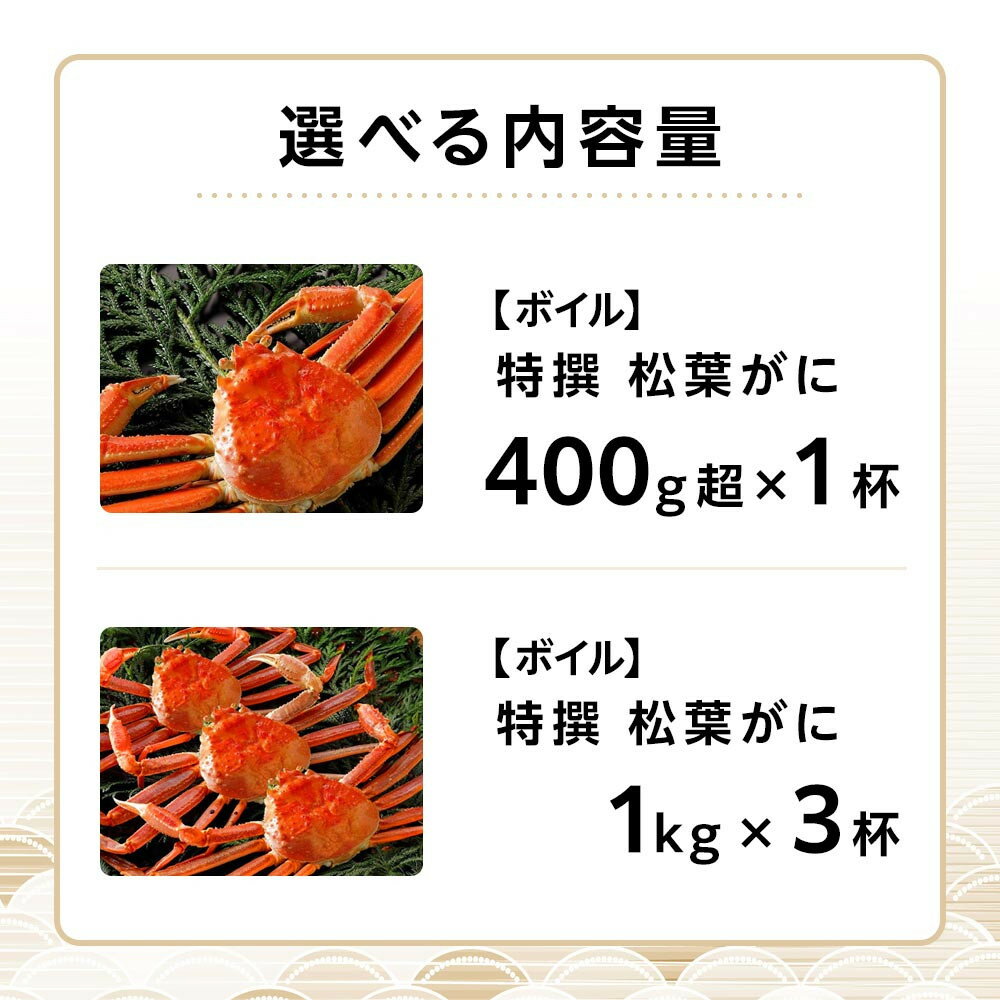 - 【ふるさと納税】内容量が選べる【ボイル】≪2025年11月発送≫ 特撰 松葉がに【ブランドタグ付き】 400g超×1杯~1kg×3杯 | 松葉ガニ 松葉がに かに 蟹 鳥取県産 特撰 ボイル タグ付き カニ味噌 みそ 新鮮 鳥取県 北栄町 おすすめ 人気