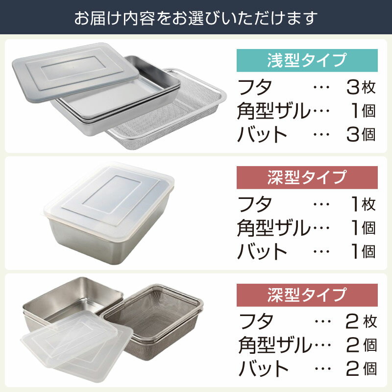- 【ふるさと納税】 蓋付きステンレスバット・角型ザルセット 浅型/深型 選べるタイプ 【 バット ザル セット ステンレス 蓋つき 油切り 揚げ物 日本製 調理器具 キッチンツール キッチン用品 アーネスト 新潟県 燕市 燕三条 】 [10002529]
