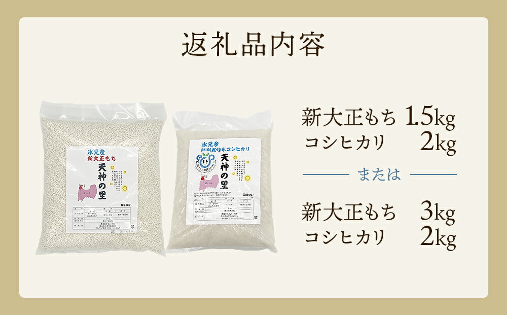 - 【ふるさと納税】富山県氷見産 新大正もち ( 1.5kg か 3kg )と特別栽培米コシヒカリ天神の里 (2kg) のセット<2025年10月中旬以降順次発送> | お米 白米 精米 氷見 富山 米 国産 数量限定 こしひかり 人気 減農薬 減化学肥料 農家直送 餅 米 もち米 おこわ 新大正糯 希少