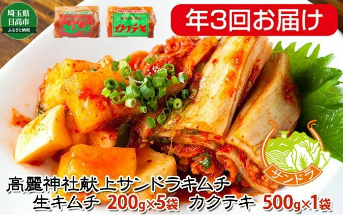 - 【ふるさと納税】定期便 3か月 冷蔵便 キムチ 200g×5 カクテキ 500g×1 セット 塩分控えめ 減塩 高麗神社献上 サンドラ 国産 白菜 漬物 乳酸菌 おかず ご飯のお供 おつまみ 発酵食品 小分け カット済み 便利 送料無料