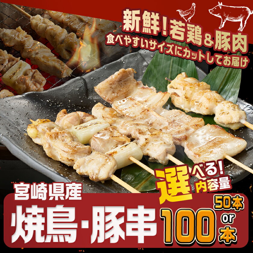 - 【ふるさと納税】【内容量が選べる!】宮崎県産焼鳥串セット - 宮崎県産 串 選べる内容量 5種50本/10種100本 焼鳥 もも身 ねぎま 肩肉 せせり 豚バラ むね身 心臓 砂肝 ハラミ ささみ 若鶏 豚肉 送料無料 SKU-M606 【宮崎県都城市は2年連続ふるさと納税日本一!】