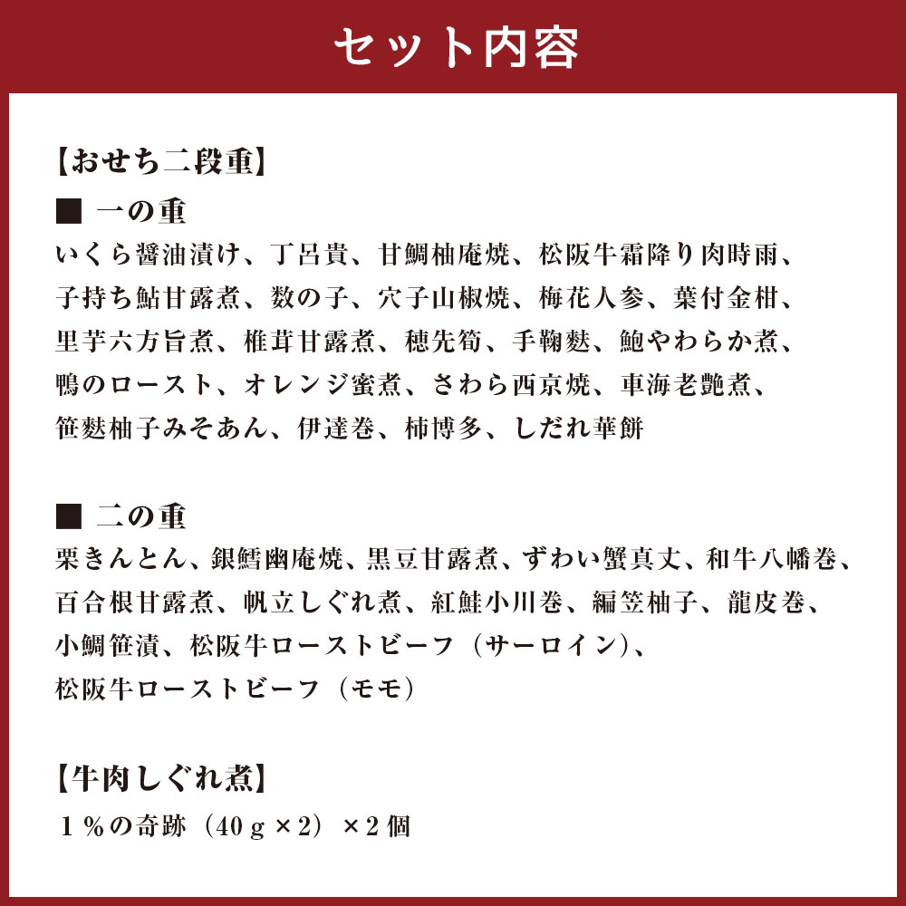 - 【ふるさと納税】松阪肉老舗 柿安 料亭おせち 二段重 「1%の奇跡」 松阪牛しぐれ煮 セット しぐれ煮(2個) 松阪牛 牛肉 お肉 ローストビーフ いくら 栗きんとん ずわい蟹真丈 水産物 お節 御節 おせち料理 お正月 年末年始 三重県 桑名市 送料無料 【2025年12月31日着】