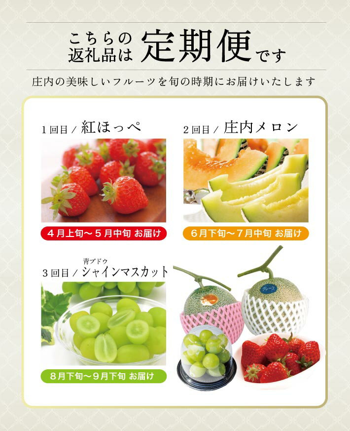 - 【ふるさと納税】≪3回定期便≫ 農家直送 おすすめのフルーツ定期便2026 いちご:4月上旬~5月中旬 メロン:6月下旬〜7月中旬 青ブドウ:8月下旬〜9月下旬 計3回 ※離島発送・着日指定不可 頒布会 果物 くだもの イチゴ 産地直送 酒田市 シャインマスカット 庄内 酒田市