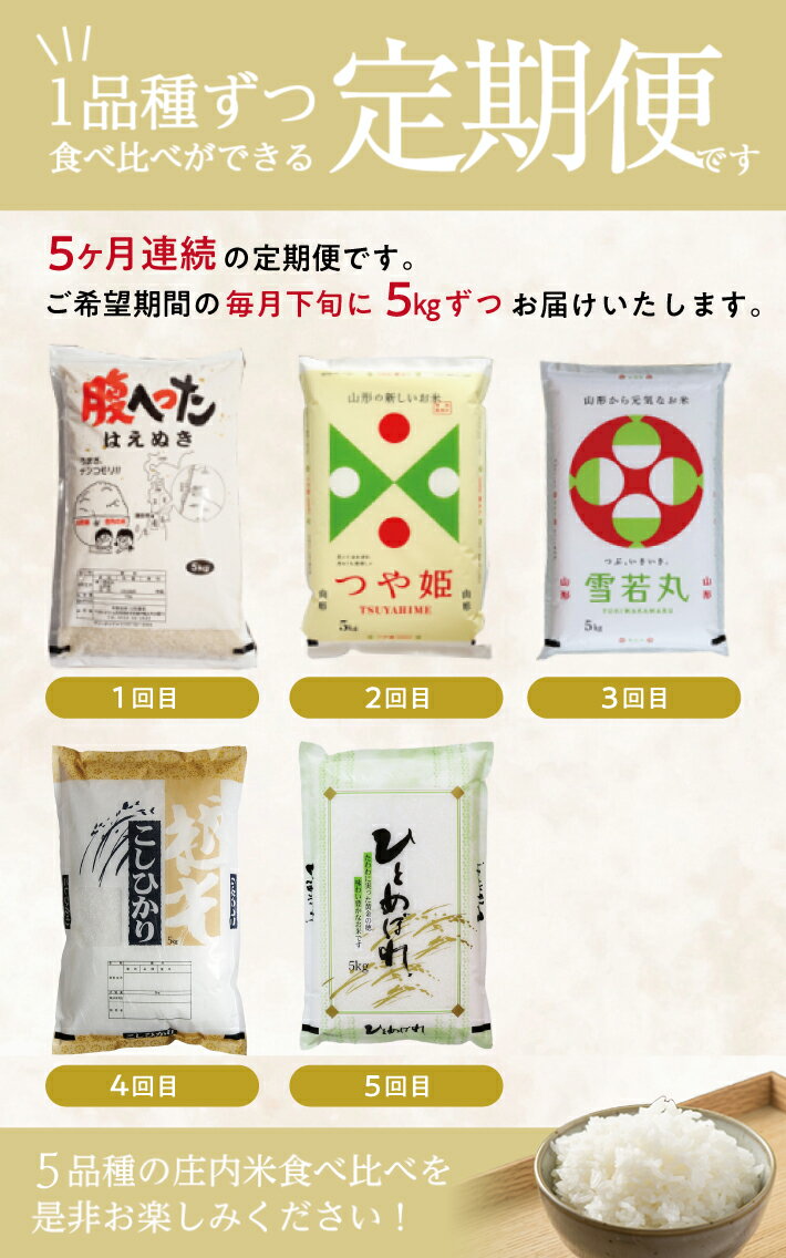 - 【ふるさと納税】≪5ヶ月定期便≫ 食べ比べ定期便 5kg×5ヶ月連続 計25kg はえぬき つや姫 雪若丸 コシヒカリ ひとめぼれ 山形県酒田産 毎月下旬頃お届け 東北 山形県 酒田市 庄内地方 ブランド米 庄内米 お米 ごはん ご飯 小分け 味比べ 連続定期便