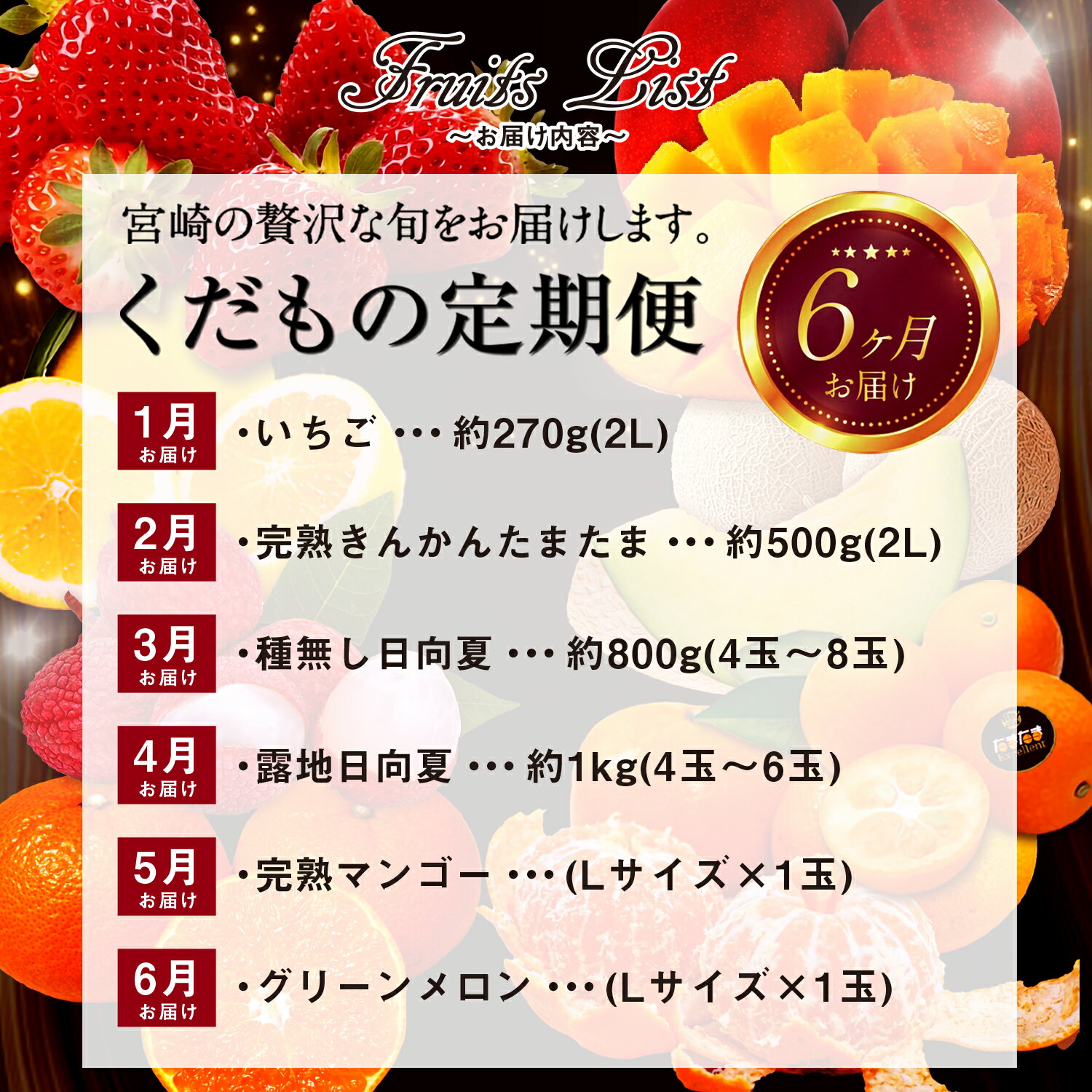 - 【ふるさと納税】《2026年発送先行予約》【数量・期間限定】青果店厳選!「6ヶ月お届け!くだもの定期便Vol.1」 宮崎 フルーツ 果物 定期便 6回 お届け いちご 完熟きんかんたまたま 種無し日向夏 露地日向夏 完熟マンゴー グリーンメロン 旬 人気 贈答 宮崎県 宮崎市