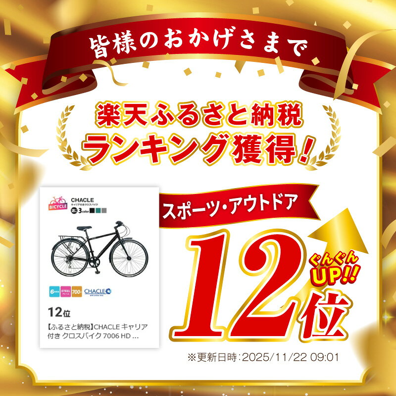 【ふるさと納税】CHACLE キャリア付き クロスバイク 7006 HD SOLUXE 700C 選べる カラー Mブラック / グリーン / グレー 自転車 完成品 エアレスタイヤ 組み立て 空気入れ 不要 オートライト アウトドア サイクリング 通勤 通学お取り寄せ 大阪府 泉佐野市 送料無料