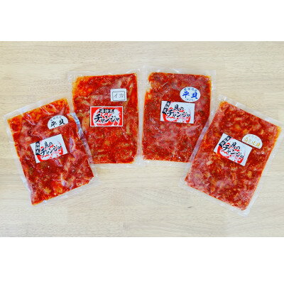 - 【ふるさと納税】 海神丸 チャンジャ 食べ比べ セット 4種 平貝 貝ひも 貝柱 白 ミル貝 イカ 各 100g パック 小分け 冷凍 海鮮 魚介 海の幸 貝 塩辛 愛知県 南知多町 人気