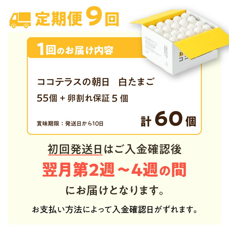 - 【ふるさと納税】【9ヵ月定期便】ココテラスの朝日( 白たまご )55個 + 5個保証【計60個】【 JGAP認証 】農家直送 新鮮 卵 純植物性飼料 飼料にこだわった 卵かけご飯 米たまご 大容量 卵 定期 送料無料