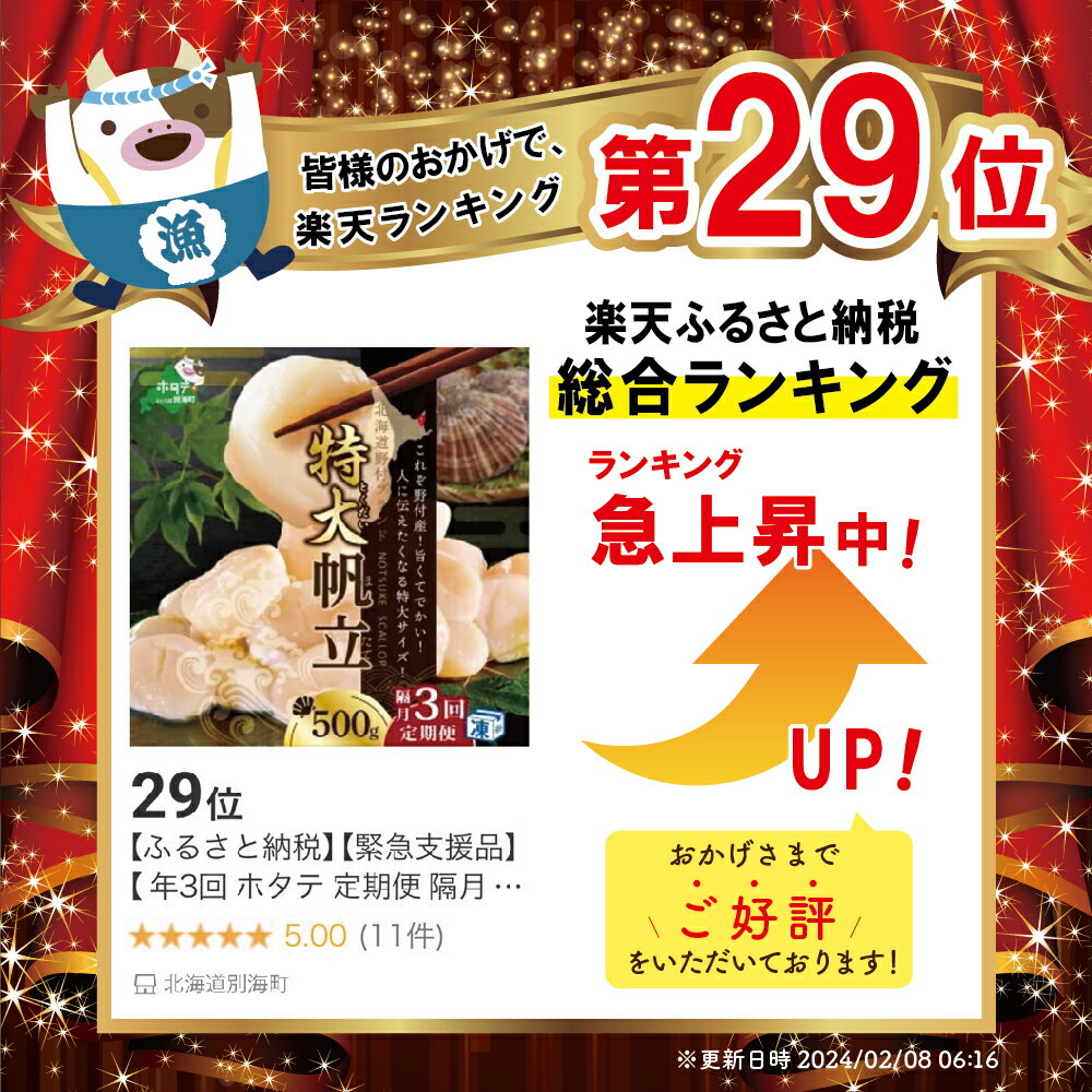 - 【ふるさと納税】 高評価★4.91 【 年3回 ホタテ 定期便 隔月 定期 】 北海道 野付産 漁協からお届け 冷凍ホタテ 貝柱 人に伝えたい驚き 特大 ホタテ 500g 3回 配送 ( ふるさと納税 ほたて 定期便 定期便 ふるさと納税 帆立 定期便 ホタテ貝柱 帆立貝柱 春 旬 )
