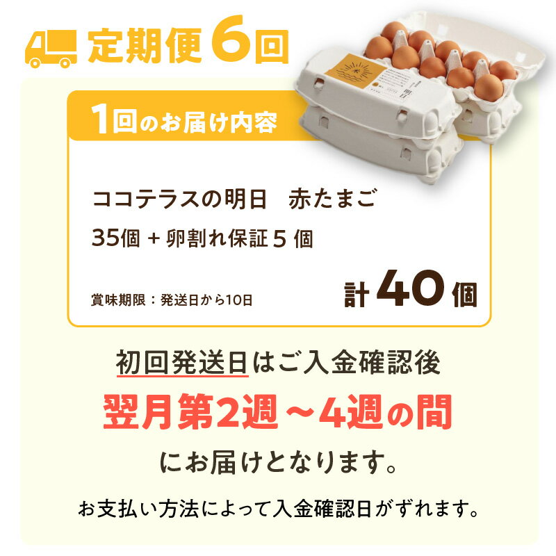 - 【ふるさと納税】【6ヵ月定期便】《テレビで紹介されました!》ココテラスの明日( 赤たまご )35個 + 5個保証【計40個】【 JGAP認証 】エサに10%の米を配合しているためコクがあります! 農家直送 新鮮 卵 純植物性飼料 飼料にこだわった 米たまご 大容量 卵 定期 送料無料