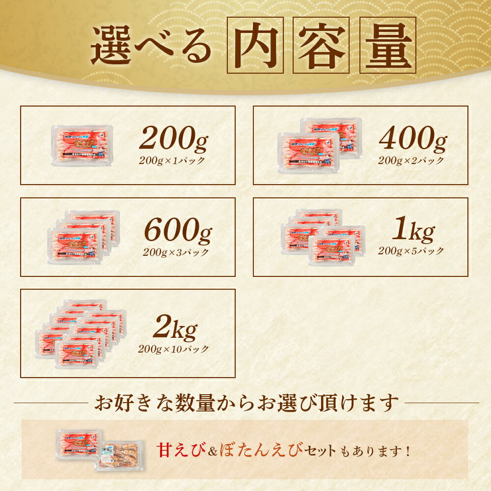 【ふるさと納税】【選べる内容量200g~2kg】超速リキッド凍結でドリップゼロ!北海道羽幌産生鮮甘えび | えび エビ 海老 甘エビ 新鮮 海鮮 人気 小分け たっぷり 甘えび丼 エビカニ 甲殻類 超速リキッド凍結 冷凍 魚介類 刺身 丼 北海道 羽幌町 羽幌 ふるさと納税【0311201】