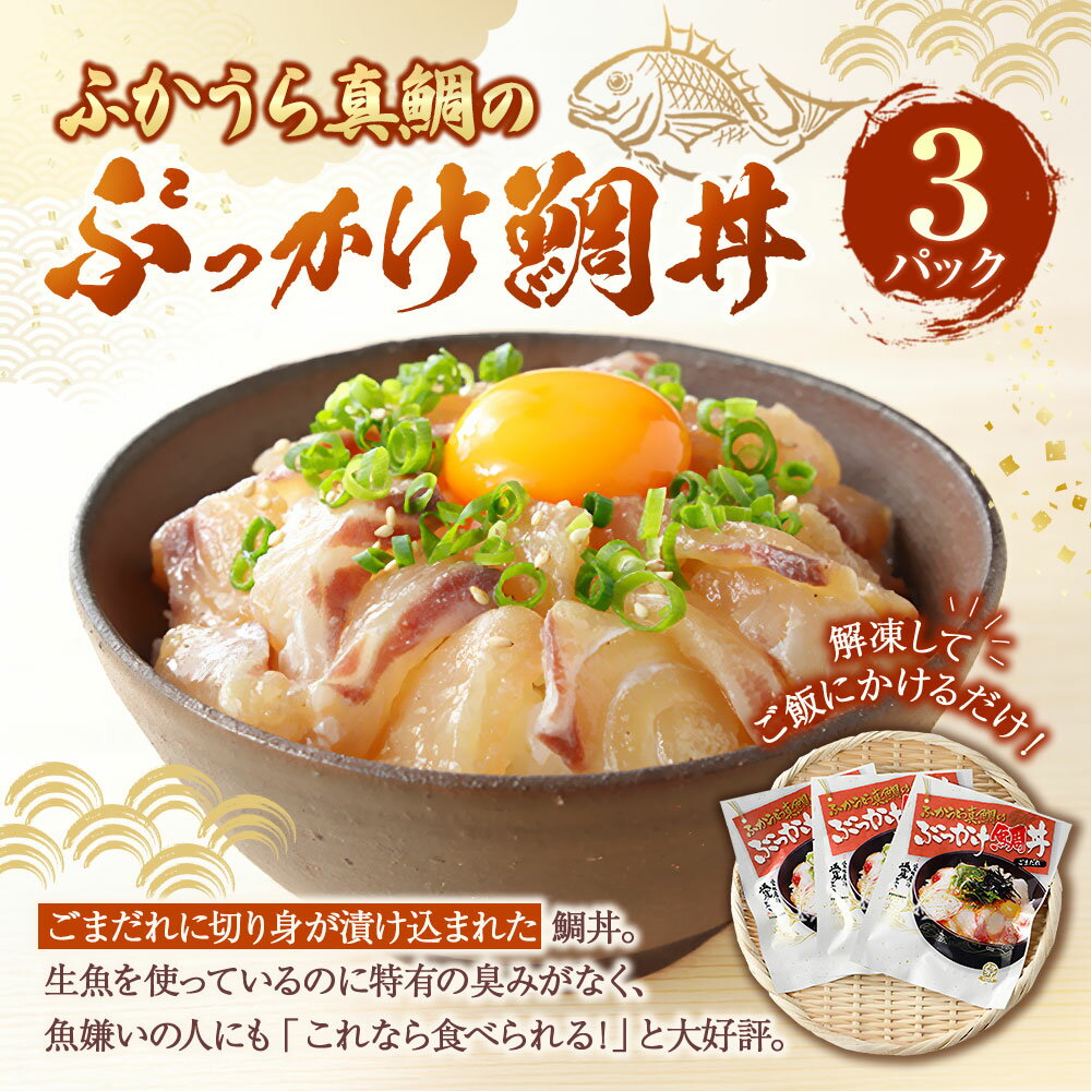 【ふるさと納税】ふかうら真鯛の ぶっかけ鯛丼 100g×3パック 鯛 タイ 真鯛 マダイ 海鮮 ゴマだれ ごまだれ たれ付き どんぶり 丼 刺身 海鮮 漬け 漬け丼 惣菜 切り身 切身 冷凍 国産 愛媛 愛媛県 送料無料(898)