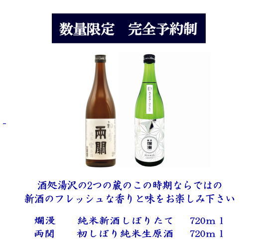 - 【ふるさと納税】予約限定酒!新酒初しぼり飲み比べAセット 720ml×2種 両関 初しぼり純米生原酒 爛漫 純米新酒しぼりたて 日本酒 酒 地酒【小川忠太郎商店】[B2-5202]