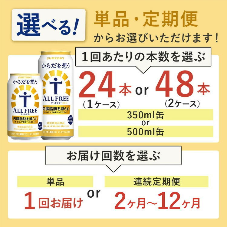- 【ふるさと納税】【選べる容量・配送回数】サントリー からだを想うオールフリー(350ml・500m×1箱・2箱)単品 定期便 (萩原酒店) | 糖質0 プリン体0 カロリー ゼロ 内臓脂肪 ノンアル ノンアルコール ビール ケース セット 箱 缶 群馬県 大泉町 ※離島への配送不可