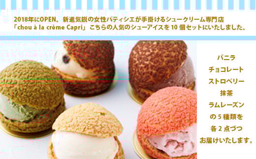 おうちでカフェ気分Capriの贅沢 シューアイスBOX バニラ チョコレート ストロベリー 抹茶 ラムレーズン 5種類 10個 シュークリーム 専門店 Capri 個包装 冷凍スイーツ 人気 洋菓子 スイーツ アイスクリーム 子ども おやつ 自分ご褒美 送料無料 大阪 河内長野