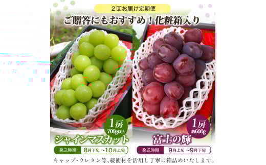 - 【2026年発送★先行予約】【山梨県産 旬の果物 定期便】 シャインマスカット 富士の輝 2回送り 180-012 | ぶどう 山梨 種無し 種なし シャインマスカット 富士の輝 ブラックシャイン ぶどう定期便 葡萄定期便 発送 定期便 定期 笛吹市 山梨県 フルーツ 果物 ぶどう 葡萄 おすすめ フルーツ定期便 産地 笛吹市 笛吹 国産 2回 期間限定 山梨県笛吹市 |