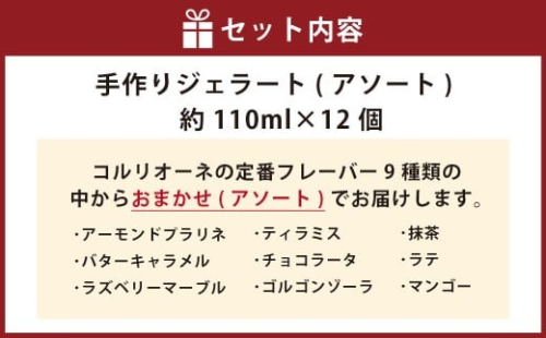 手作りジェラート 12個セット(アソート) 各110ml×12個 おまかせ 12個 フレーバー アーモンドプラリネ 抹茶 バターキャラメル ラテ ラズベリー マーブル チョコラータ ティラミス ゴルゴンゾーラ マンゴー 菊川市 静岡県