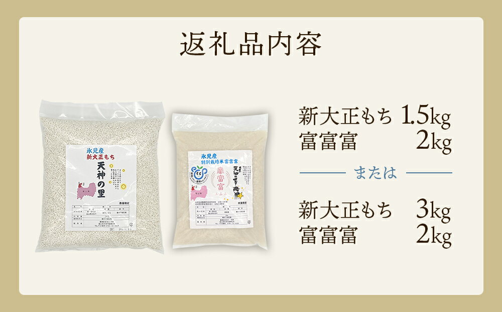 - 【ふるさと納税】富山県氷見産 新大正もち ( 1.5kg か 3kg )と特別栽培米富富富(2kg)のセット<2025年11月以降順次発送> | お米 白米 精米 氷見 富山 米 国産 特別栽培 数量限定 ふふふ 減農薬 減化学肥料 環境にやさしい 農家直送 餅 米 もち米 おこわ 新大正糯 希少
