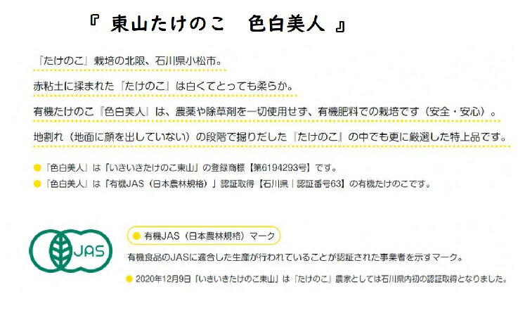 - 【ふるさと納税】【来春先行予約】 有機 JAS 認証 小松市産 白子たけのこ 「 色白美人 」 旬 筍 竹の子 タケノコ たけのこ 限定 朝堀り 朝採れ 朝どれ お中元 お歳暮 ギフト 小松市 石川県 037008【いきいきたけのこ東山】