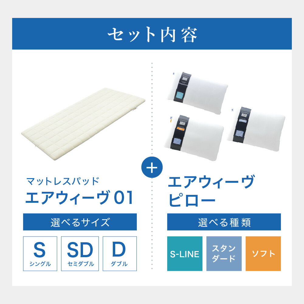 - 【ふるさと納税】エアウィーヴ 01 枕セット 選べるサイズ ( シングル・セミダブル・ダブル ) ピロー ( S-LINE・スタンダード・ソフト ) | 高反発 マットレスパッド マットレストッパー ベッドパッド 高反発 寝返り 体圧分散 マットレス 日本製 airweave エアウィーブ