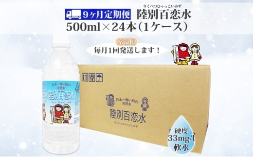 - 定期便 9ヶ月 天然水 陸別 百恋水 500ml 24本 硬度 33mg/L 毎月発送 500 ミリリットル ミネラルウォーター