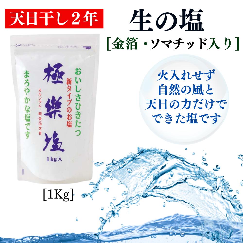 - 天日干し2年 火入れしない生の塩 「極楽塩」 1kg×1袋 金箔 貝カルシウム入り 食べる楽しさを極め こだわりの製法 塩 食塩 食卓塩 海塩 調味料 ミネラル ソルト