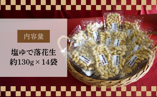 - 塩ゆで落花生 14袋 約130g/袋 計約1820g | 落花生 塩茹で 塩ゆでピーナッツ ピーナッツ おつまみ ナッツ類 栄養 たんぱく質 食物繊維 タンパク質 コレステロール お菓子 コーヒータイム お酒 ギフト プレゼント おすそ分け 贈答用 手土産 埼玉県 東松山市 ネイブルホリコシ