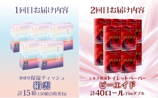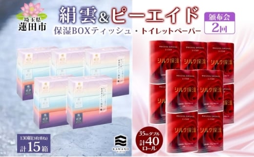 頒布会2回 新保湿ティッシュ 絹雲 ボックスティッシュ 130組( 3枚重ね )×15箱 河野製紙 ピーエイド シルク40ロール やわらかい まとめ買い 備蓄 日用品 常備品 消耗品 大容量 防災 埼玉県 蓮田市