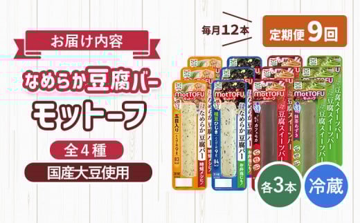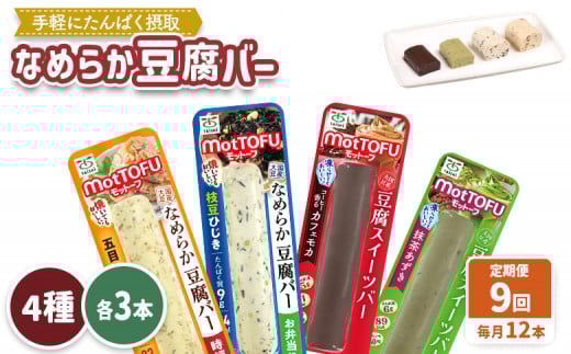 - 【定期便:9回】【たんぱく質】なめらか豆腐バー「モットーフ」全12本(4種×各3本) | 健康 豆腐バー 植物性タンパク質 タンパク質 植物性たんぱく質 お手軽 朝ごはん おやつ 間食 ヘルシー お取り寄せ 宮城県 白石市 白石【53020】