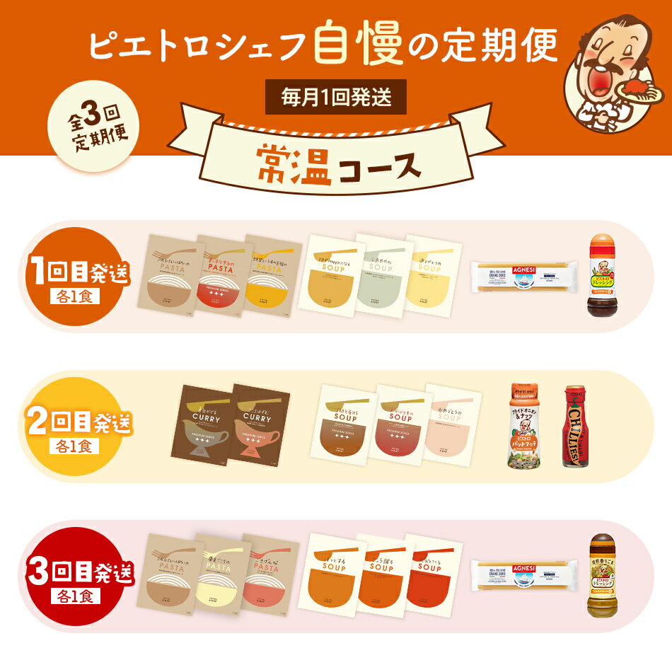 - 【ふるさと納税】ピエトロ シェフ自慢の定期便 常温コース レトルト 常温保存 計3回発送 パスタ パスタ麺 カレー ピエトロドレッシング スープ ボロネーゼ ペペロンチーノ カルボナーラ ミネストローネ 調味料 古賀市 福岡県