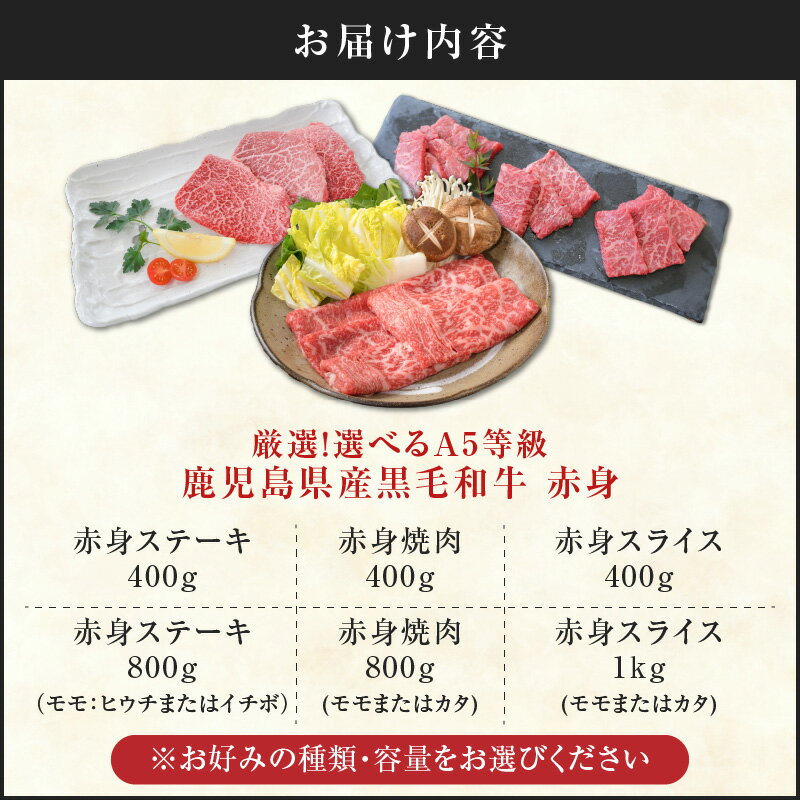 - 【ふるさと納税】 厳選 選べる A5等級 鹿児島県産 黒毛和牛 赤身 400g 〜 1kg 牛 肉 ステーキ 焼肉 焼き肉 スライス モモ ヒウチ イチボ カタ ヘルシー 鹿児島産 国産 和牛 精肉 おいしい カミチク 鹿児島 おすすめ ランキング プレゼント ギフト