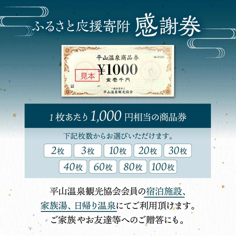 【ふるさと納税】《選べる枚数!》平山温泉 観光協会ふるさと応援寄附 感謝券 2枚~100枚 (1枚当たり1000円相当)【一般社団法人 平山温泉観光協会】(レターパックプラス)[ZBW003]
