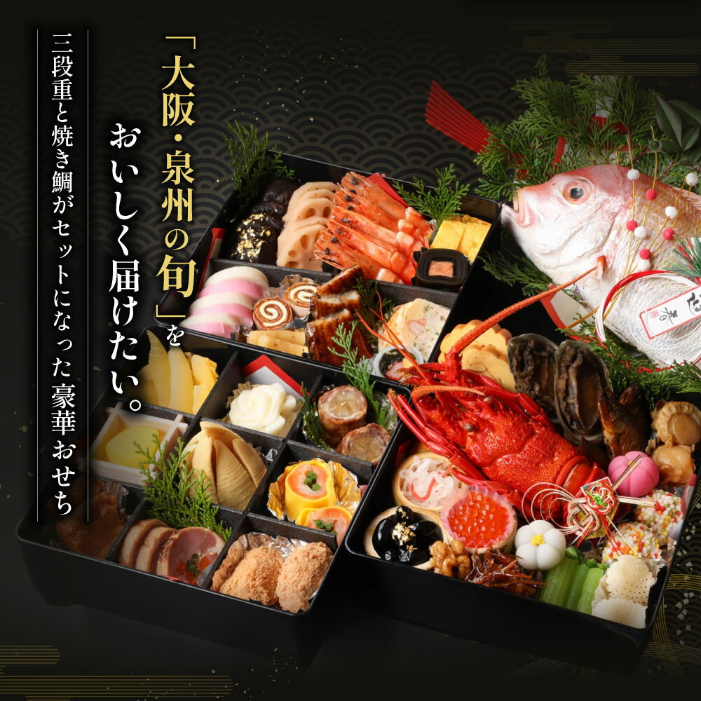 - 【ふるさと納税】おせち料理 【寿】 三段重と焼鯛 (4~5人前) 120000円 12万円 【2025年12月31日着】 おせち お節 御節 お正月 4人前 5人前 三段重 お重 焼鯛 鯛 割烹 大規鮨し 日本料理 先行予約 予約 大阪府 阪南市 送料無料