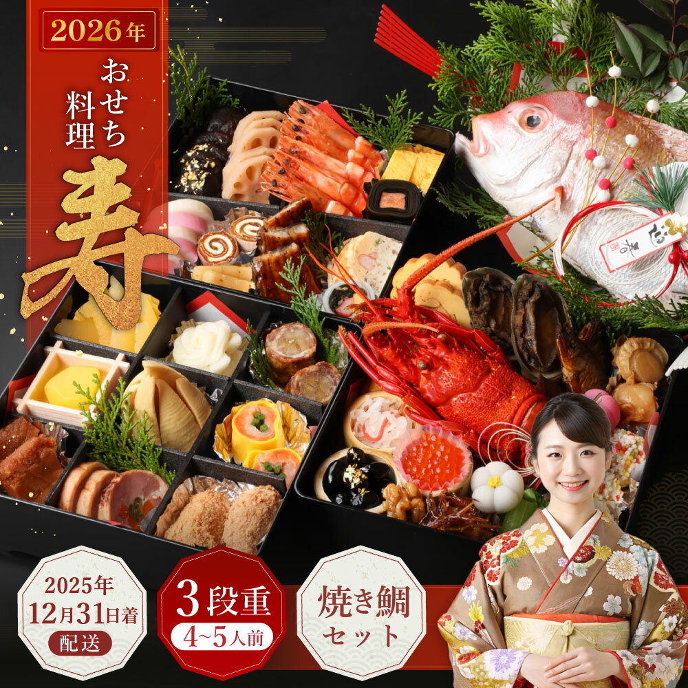 【ふるさと納税】おせち料理 【寿】 三段重と焼鯛 (4~5人前) 120000円 12万円 【2025年12月31日着】 おせち お節 御節 お正月 4人前 5人前 三段重 お重 焼鯛 鯛 割烹 大規鮨し 日本料理 先行予約 予約 大阪府 阪南市 送料無料