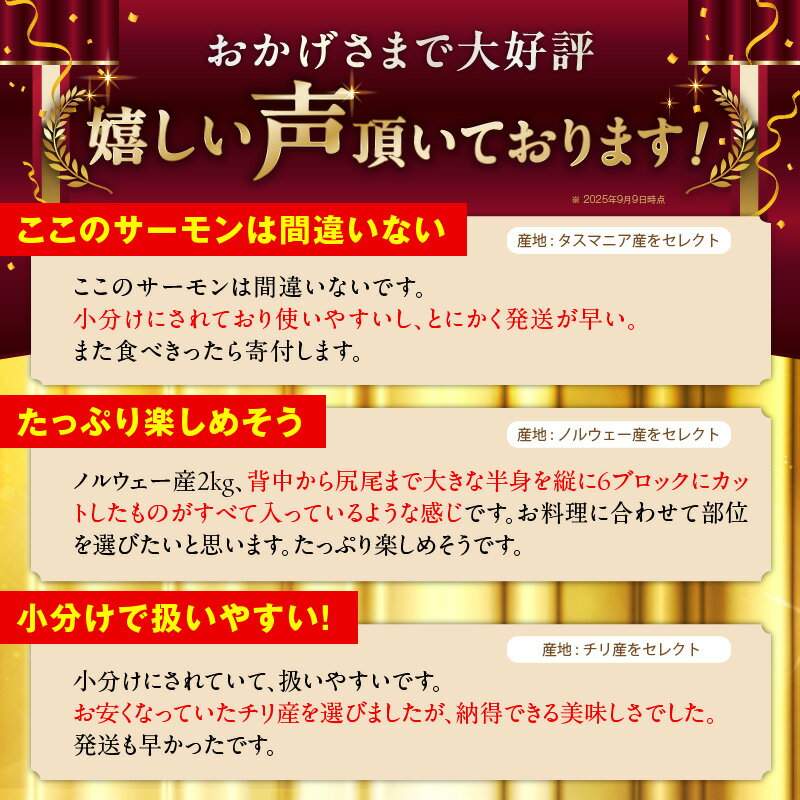 - 【ふるさと納税】高評価★4.72 サーモン 1kg / 2kg ブロック 産地 選べる チリ産 / タスマニア産 / ノルウェー産 鮭 シルバーサーモン アトランティックサーモン サイズ不揃い 刺身 海鮮丼 サラダ 魚介類 訳あり 大阪府 泉佐野市 送料無料